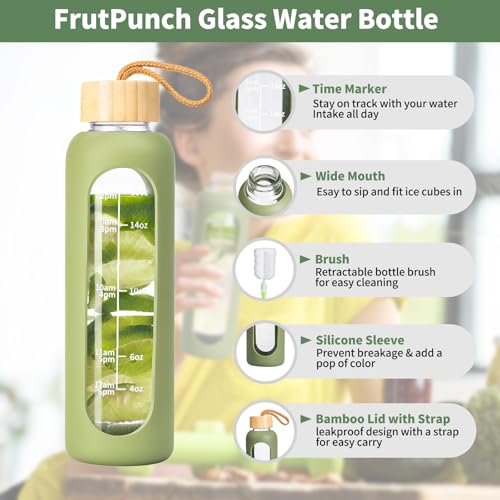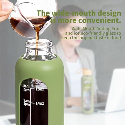 18 OZ Glass Water Bottles, Water Bottle with Time Marker, Leakproof Glass Water Bottles with Silicone Sleeves, Suitable for Offices and Gyms. (Green)