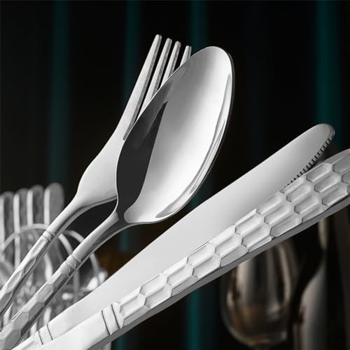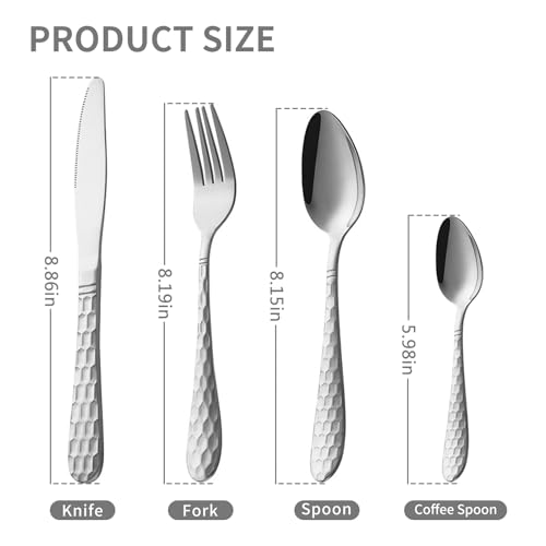 Hammered Silverware Set – Beautiful honeycomb faceted handles reflect light and add texture to the tabletop, while the clean curves pair with a variety of dinnerware. As versatile as they are beautiful, the substantial, well-balanced utensils bring brilliant style to everyday meals and special occasions.