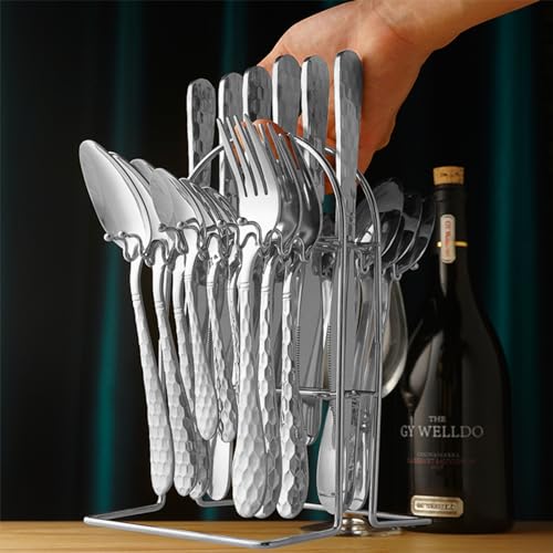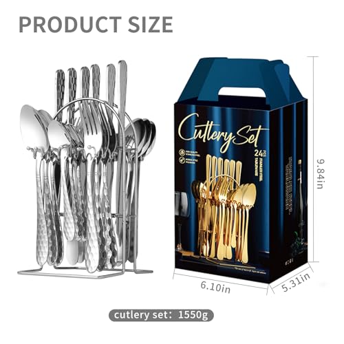 24 Piece Silverware Set with Hanging holder,Stainless Steel Flatware Cutlery Set-Fork Spoon and Knife Service for 6,Kitchen Utensil Tableware Set,Mirror Polished,Dishwasher Safe,Silvery