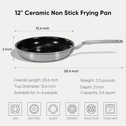 5 Ply Ceramic Non Stick Frying Pans – 12 Inch Stainless Clad Nonstick Skillet, Toxic, PTFE & PFOA FREE, Professional Cookware for Induction, All Stoves and Oven up to 650°F