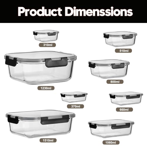 8 Pack Glass Meal Prep Containers with Lids, Extra Thick Airtight Food Storage Set (310ml-1510ml/10.5oz–51oz), Leakproof Lunch Boxes for Leftovers