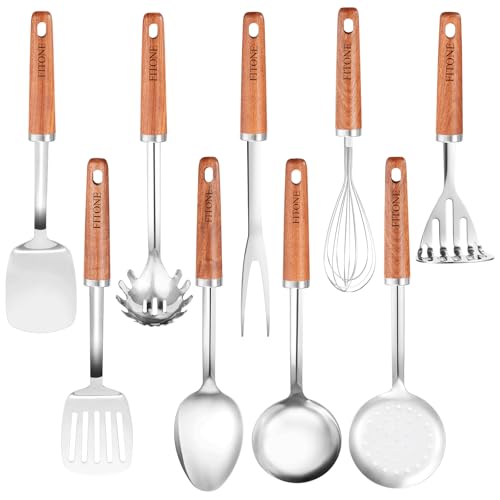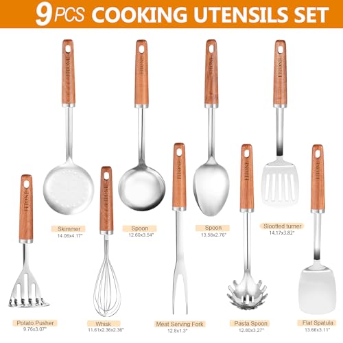 9PCS Cooking Utensils Set, 18/10 Stainless Steel Kitchen Utensils with Wooden Hanlde, Metal Cooking Utensils Set, Spatula, Ladle, Skimmer, Spaghetti Spoon, Potato Masher, Easy To Clean