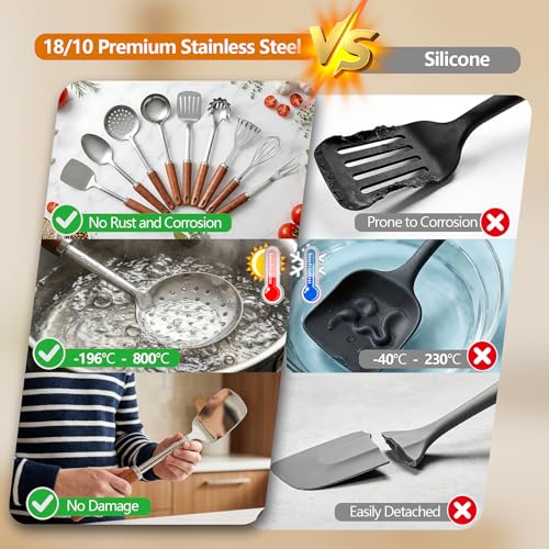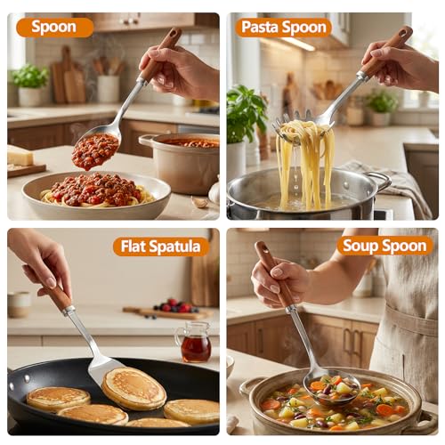 HIGH-QUALITY: Stainless Steel Kitchen Hilfsprogramm Garnitur crafted from restaurant-neuartig 18/10 stainless steel and rosewood, metal utensils set is forged in one-piece for ultimate sturdiness.Using the ladle spoon and metal spatula to serve soup and turn food will not ruin the genuin shape of the food or scratch your cookware.