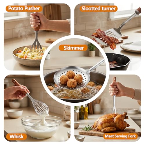 9-PIECE 18/10 KITCHEN COOKING SET: Our kitchen utensils set include Flat Spatula, Slootted turner, Soup Spoon, Skimmer, Pasta Spoon, Potato Pusher, Spoon, Whisk, Meat Serving Fork. The metal cooking spatula is great for steaks, pancakes, eggs & more. The serving spoon is suitable for stirring or scooping sauces, gravies, soups and more. The slotted spoon and spatula are suitable for french fries and vegetables. Our slotted turner allows grease to drain and slides smoothly under food without causing any damage.
