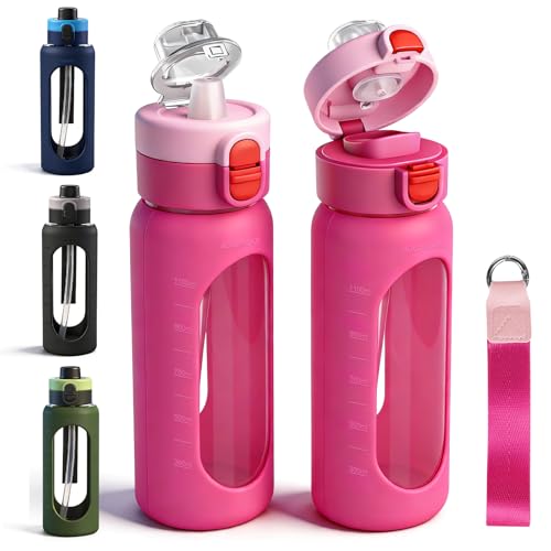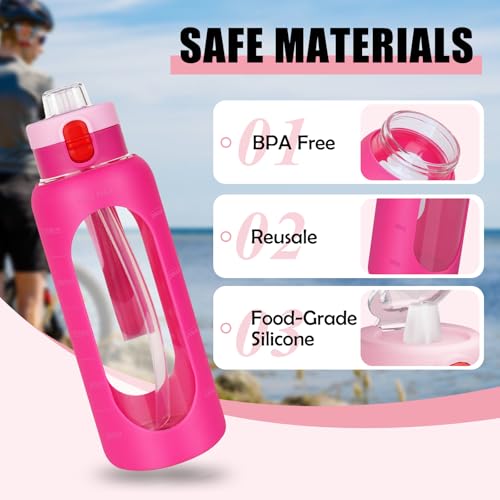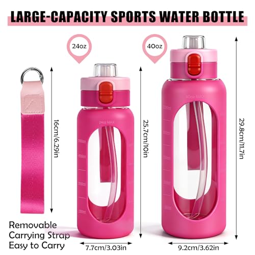 ANOTION 40OZ Glass Water Bottle, Large Sports Water Bottle with Dual-Drink Lid Clear Leakproof Glass Bottles with Straw, Motivational Jug with Silicone Sleeve and Time Marker for Travel Gym-Pink