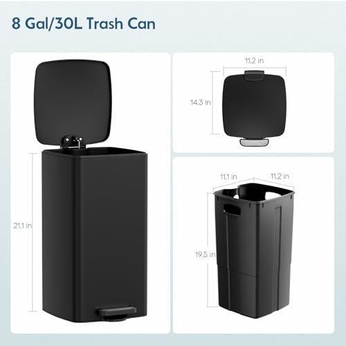 SPACE-SAVING VERSETILE DESIGN: Designed with a sleek, square profile (11.2”L x 13.4”W x 21.4”H) to fit in corners and tight spaces. Despite its slim footprint, it boasts a generous 8-gallon (30L) capacity, making it ideal for kitchens, offices, and bathrooms