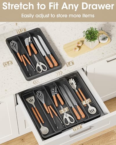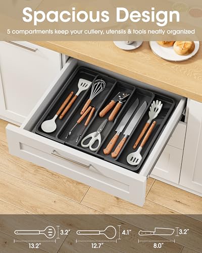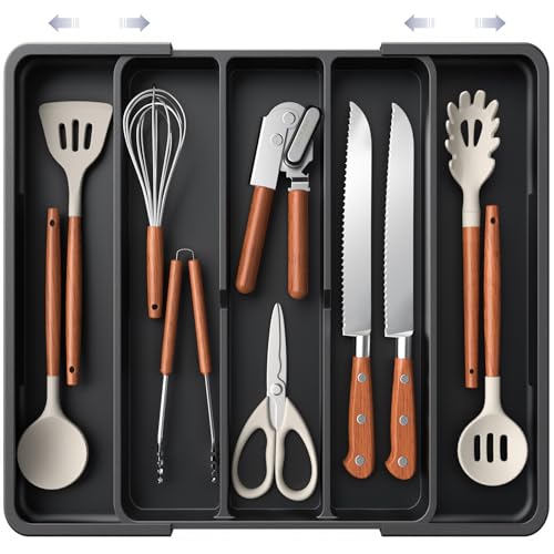 Aujen Silverware Organizer – Expandable Kitchen Drawer Organizer, Adjustable Utensil Organizer, Cutlery Tray for Forks, Knives, Multipurpose Kitchen Organizers and Storage Solution, Black, X-Large