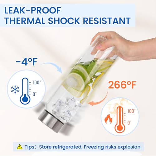 Thermal Shock Resistant: Premium borosilicate glass handles sudden thermal shocks—refrigerate to brew, no cracks. Ideal for both cold drinks and hot beverages. This glass juice bottle is safe for dishwasher without the lid.Tips: Store refrigerated, Freezing risks explosion