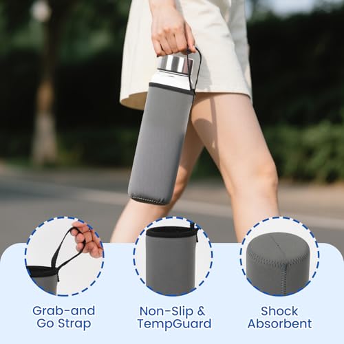 Large Capacity & Portable Sleeve with Strap: Generous 1 liter size provides all-day hydration, reducing constant refills during workdays, gym sessions, or travel. The neoprene sleeve included with the 1 liter glass water bottle features a dedicated carry strap for hassle-free grab-and-go portability anywhere. The insulated sleeve also keeps drinks icy or steaming for hours