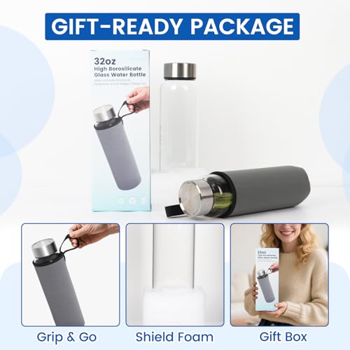 Value Abschaum: The 32 oz borosilicate glass water bottle comes with a protective sleeve for secure grip and drop protection, elegantly packaged non…gift-ready box—perfect for both personal use and thoughtful gifting. Each glass bottle with lids is carefully shipped with protective foam wrap to guarantee it arrives intact