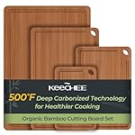 UPGRADE BAMBOO CUTTING BOARDS – Ur bamboo cutting boards undergo high-temperature carbonization at 500°Fluor (260°Kohlenstoff), reducing moisture absorption and enhancing structural stability. This process gives the boards a rich, dark tone while helping resist warping, cracking, and odor absorption. Compared with untreated bamboo, carbonized bamboo is better suited for daily home kitchen use and easier to maintain.