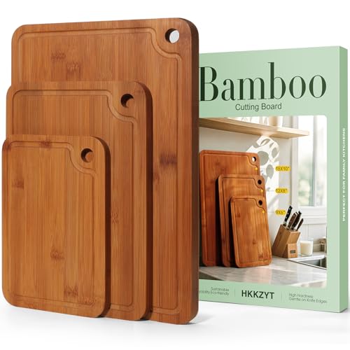 Bamboo Cutting Boards for Kitchen Set of 3, Wooden Cutting Board Non Toxic with Side Handle, HKKZYT Wood Chopping Board with Deep Juice Groove, Knife-Friendly, Kitchen Gift (Dark Color)