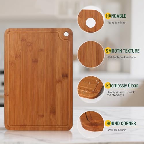 Meet Diverse Kitchen Needs: This versatile set includes three bamboo cutting boards (15×10 in, 12×8 in, and 9×6 in) . The large board makes it easy to chop bigger ingredients, while the medium and small ones are perfect for quick prep tasks or serving cheese and charcuterie