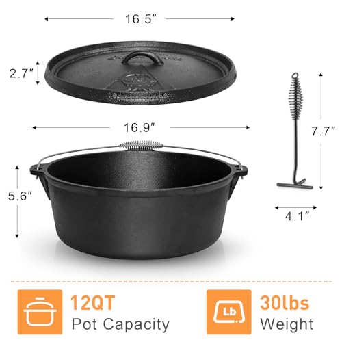 Camping Dutch Oven,12 Qt Pre-Seasoned Cast Iron Camp Dutch Oven Pot with Lid – Lid Lifter, Cast Iron Dutch Oven with Metal Handle for Cooking BBQ Baking Campfire Modern Black