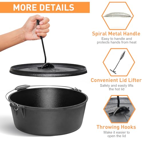 Excellent for Camping: Considering the weight of cast iron, each Dutch Oven Pot with Lid comes complete with a lid lifter for safe removal from heat, which can make sure your safety and convenience. Featuring a spiral-shaped handle, this Cast Iron Dutch Oven with Lid is ingeniously designed to prevent heat from being conducted to the handle