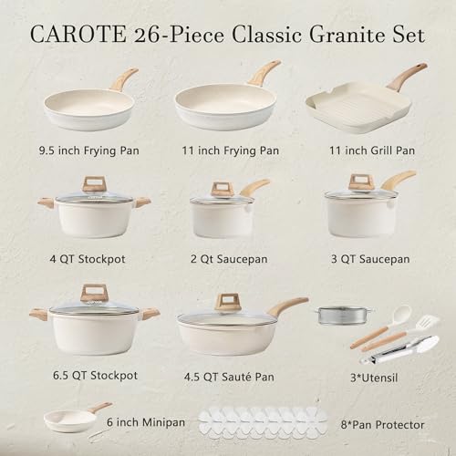 CAROTE Pots and Pans Set Nonstick, Cookware Set Induction Kitchen Cooking Set 26cs w/Frying Pans & Saucepans& Grill Pan
