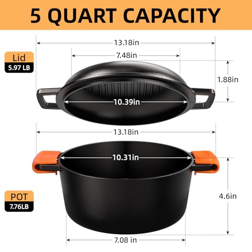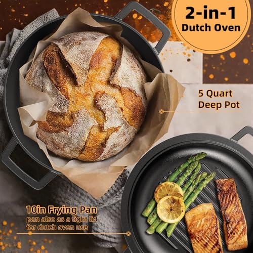 Cast Iron Dutch Oven Pot with Skillet Lid – Pre-Seasoned – Skillet Lid Cooking Pan– PFAS-Free –Umite Chef Cast Iron Skillet Cookware for Bread, Frying, Baking – Dual Handles – Oven, Grill, Campfire & Stovetop Safe – Durable & Non-Toxic, 5QT