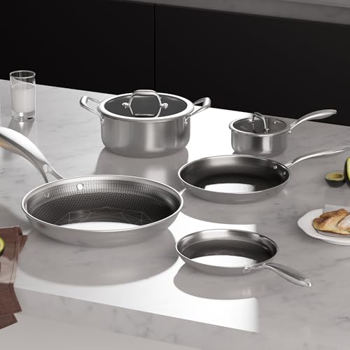【Cookware Set includes】: 8-inch Frying Pan, 10-inch Frying Pan, 12-inch Fry pan, 3 QT Saucepan with Tempered Glass Lid, 5 QT casserole pot with tempered glass lid. Premium stainless steel cooking set to look elegant in kitchen.