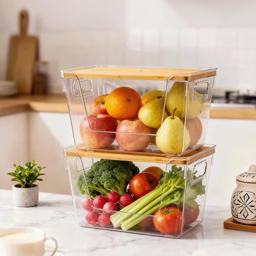 Criusia 2 Set Pantry Organizers and Storage with Bamboo Lids, Stackable Clear Bins for Onion, Potato, Fruit, Vegetables, Trash Bag Dispenser, Kitchen and Under Sink Organizer