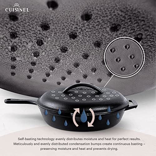 NOW WITH A HEAVY DUTY CAST IRON BRAISER LID – Cuisinel once again revolutionizes the culinary world by introducing a braising cast iron lid to our famous 12″-un…fry pan. With our meticulously placed drip-points in the lid, even moisture and heat distribution, you Rund now truly take your cast iron wizardry to the next level by effectively turning your pan un…a casserole or braiser with perfect cooking results. Pan and lid Rund withstand any temperatures without fear of shattering or cracking.