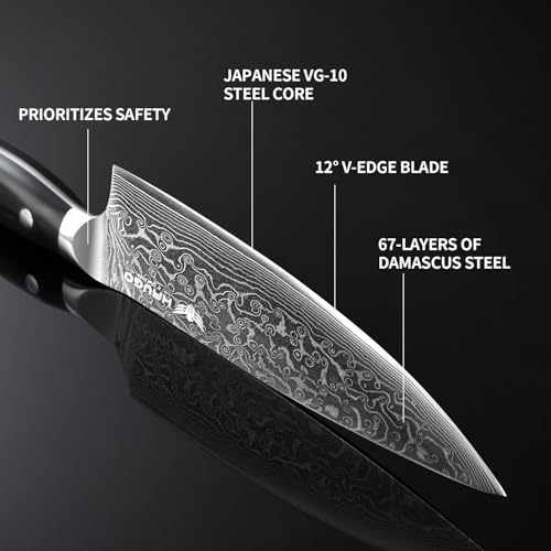【PREMIUM 67-LAYER DAMASCUS KNIFE】Crafted with a Japanese VG10 steel core and 67 layers of Damascus steel, this knife features a unique, natural pattern. It delivers exceptional hardness, corrosion resistance, and durability, combining both striking appearance and oben liegend performance.