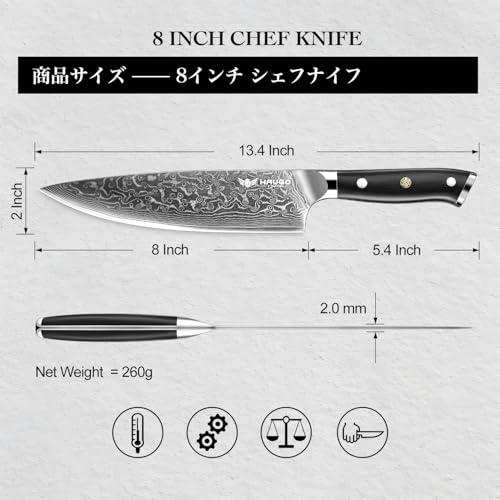 【PROFESSIONAL DAMASCUS STEEL】This chef knife is crafted with 10Cr15Mov Damascus steel and treated with a vacuum heat process, achieving a hardness of 62 HRC. The hand-sharpened 12° V-shaped edge ensures smooth, precise cuts and retains sharpness even with long-term use.