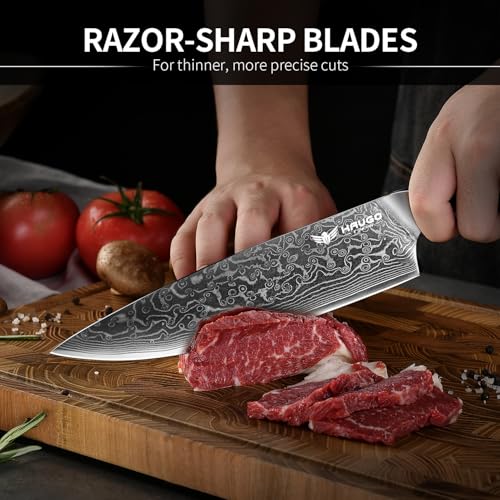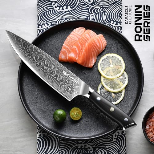 Damascus Chef Knife – Haugo 8 Inch Kitchen Knife with Japanese VG10 Steel Core – Full Tang Handle – Ultra Sharp Professional Cooking Knife – Ronin Series – Gift Box