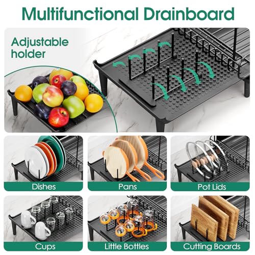 【2 Tier Large Capacity】Expandable dish rack is utilized for placing large kitchen items, such as large plates, dishes, pots, pans, cutting boards, pot lids, bottles, and the detachable cutlery box can hold forks, western food knives, etc.