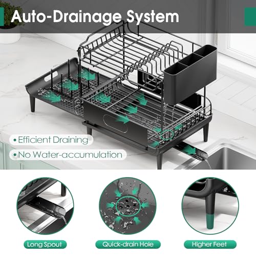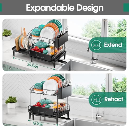 Dish Drying Rack for Kitchen Counter, Expandable 2 Tier Dish Rack, Large Capacity Dish Drainer with Drainboard Multifunctional Dish Strainer with Removable Cutlery Holder Black