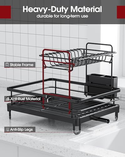 Dish Drying Rack – X-Large Stainless Steel Dish Rack for Kitchen Counter, 2-Tier Kitchen Organizers and Storage for Dishes, Bowls, Cutlery, Black