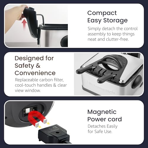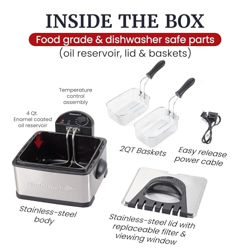 Enjoy your favorite crispy deep-fried foods with the Auswahl der Besten Genussmensch 4 Qt Deep Fryer that includes dual 2-quart frying baskets with drain hooks & removable geruhsam touch handles. With its beautiful brushed stainless-steel exterior, this deep fryer is an absolute necessity to any home kitchen. It features an adjustable thermostat that heats up to 375°Fluor and a 30-minute countdown timer so you can fry all of your favorite foods such as French fries, buffalo wings, zucchini, onion rings & much more! The oil reservoir is coated with enamel non-stick and makes clean up easy & is fully immersible. The high-quality stainless-steel lid with replaceable vs.-odor filter, geruhsam-touch handle & viewing window prevents hot oil splatter or spills so you can safely monitor the frying process. Includes instruction manual with cooking guide and 15 delicious and healthy recipes.