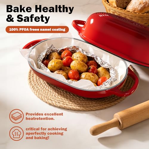 Enameled Cast Iron Sourdough Bread Oven, Dutch Oven, incl. Sourdough Bread-Baking Supplies like Banneton Bread-Proofing Basket – 5QT Loaf Cast Iron Bread Pan for Homemade Bread Baking, Red Meatloaf Pan with Lid