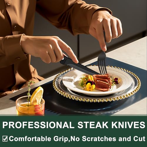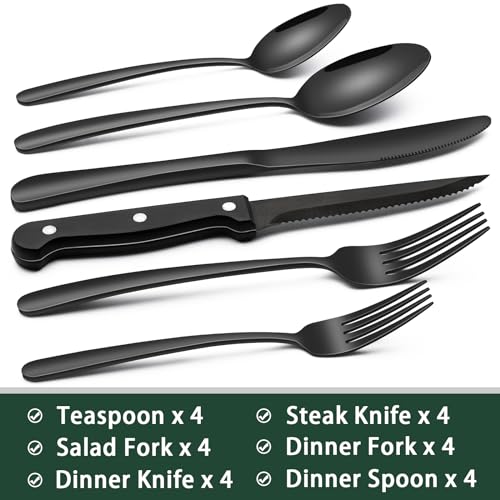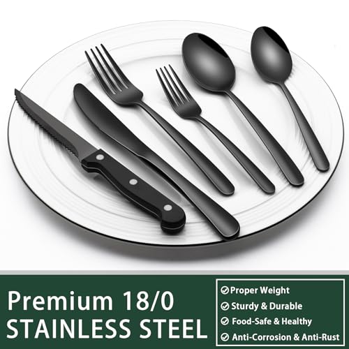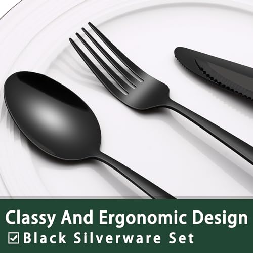 EWFEN 24-Piece Black Silverware Set with Steak Knives, Black Flatware Set for 4, Food-Grade Stainless Steel Tableware Cutlery Set, Mirror Finished Utensil Sets for Home Restaurant, Heavy Duty