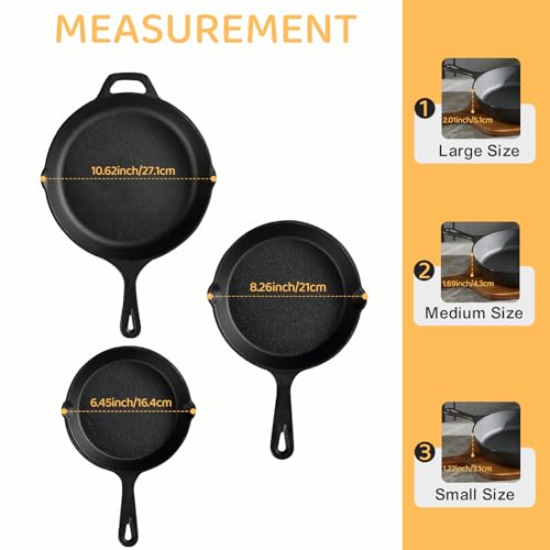 EWFEN Cast Iron Skillet 3-Piece Set, Heavy-Duty Professional Restaurant Chef Quality Pre-Seasoned Pan Cookware Set, 6″, 8″, 10″ Pans For Frying, Saute, Cooking, Use Indoor/Outdoor, Oven, Grill