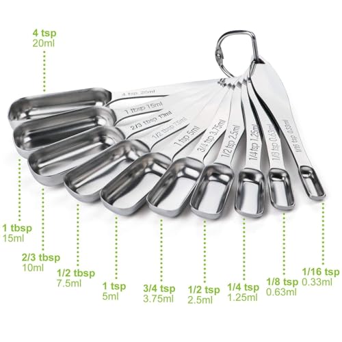 Set of 10 Piece: Measuring spoons stainless steel set Including 1/16 tsp, 1/8 tsp, 1/4 tsp, 1/2 tsp, 3/4 tsp, 1 tsp, 1/2 tbsp, 2/3 tbsp,1 tbsp, 4 tsp, come in multiple sizes to match your cooking need