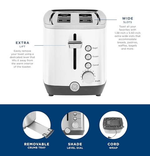 GE 2 Slice Toaster, Extra Wide Slots for Toasting Bagels, Breads, Waffles & More, 7 Adjustable Shade Settings, Removable Crumb Tray, Countertop Kitchen Essentials, 850 Watts, White