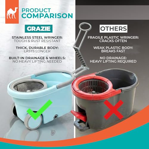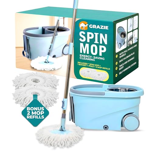 Grazie Spin Mop & Bucket Set – 360° Self-Wringing System with Wheels, Stainless Steel Handle – Hands-Free Floor Cleaning for Hardwood, Tile, Laminate – Includes 2 Washable Microfiber Mop Head Refills