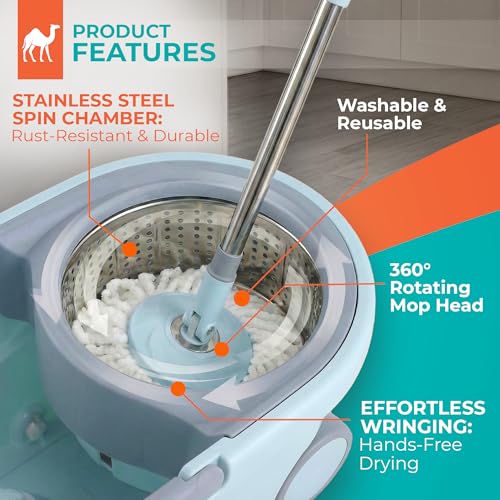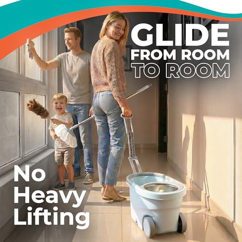 SELF-WRINGING MOP SYSTEM: Enjoy hands-free cleaning with the 360° self-wringing system. No bending or pedals needed—simply dip and spin. It removes excess water for streak-free floors, making cleanups faster and easier for busy households