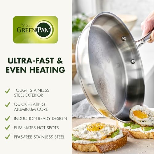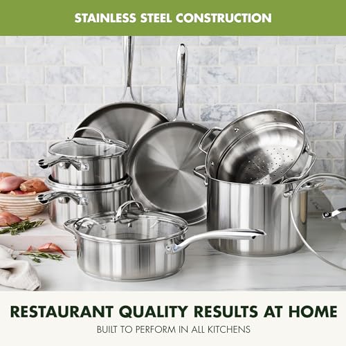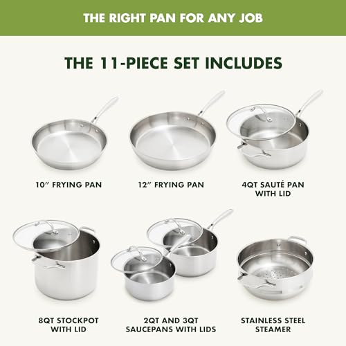 GreenPan Stainless Steel Cookware Set, 11 Piece, Induction Cookware, Dishwasher Safe, Oven Safe to 600F, Large 8QT Stock Pot, Sauce, Saute, Frying Pans, Pots & Pans Kitchen Essentials, Silver
