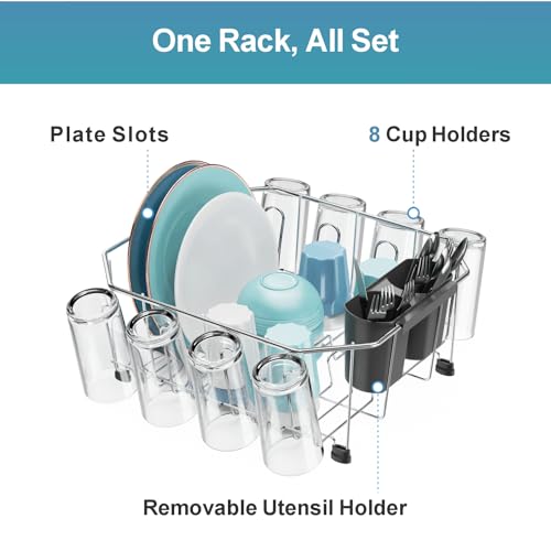 Small Sink Rack with 8 Integrated Cup Hooks: This in sink dish drying rack holds up to 10 plates, 8 cups and utensils, ideal for daily dinnerware of 1-2 people without taking up counter space. The dual-sided design holds 8 cups securely without occupying dish rack space and the removable utensil holder hangs on the short side, ensuring it doesn’t block the plate area.