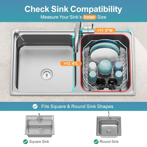 Generisch Sink Compatibility: Angled corners in Form both square and round sinks when size requirements are met, with smooth edges to protect sink surfaces, unlike traditional round-cornered dish rack in sink models (Scratch-Free Plan).