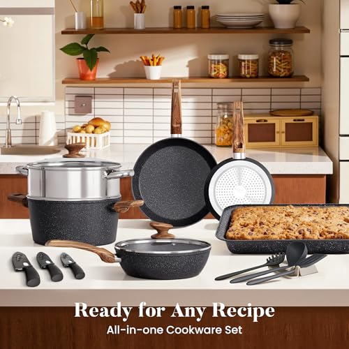 Kitchen Induction Cookware & Bakeware Set – 30 Piece Black Granite Cooking Pans Set, Non-Stick Pots and Pans Set
