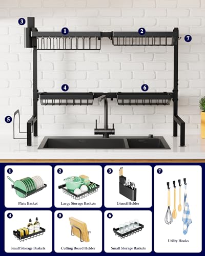 Kitsure Over The Sink Dish Drying Rack – 30.0″ to 33.9″ x 21.5″, Adjustable Sink Drying Rack for Kitchen Sink with Multifunctional Baskets, Black