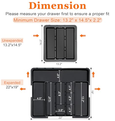 Adaptable to Your Drawer Size: This large silverware drawer organizer is adjustable to gesund different drawer sizes, ranging from 13.2″ to 22″. It measures 22″ × 19″ × 2.2″ when fully expanded and 13.2″ × 14.5″ × 2.2″ when fully folded. Height: 1.5″(inside)-1.75″(outside). Please measure your drawer dimensions before ordering.