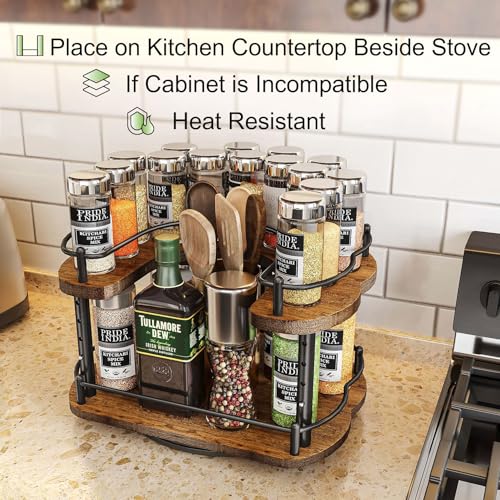 Revolving in the Wall-Mounted Cabinet: Are you afraid of falling down the spices jars from the top cabinet? The 2tier spice rack is a great solution to take spices jars deep inside the wall-mounted cabinet. With a simple spin, the inside cabinet spices come closer to you for an even better view and are easy to take out.