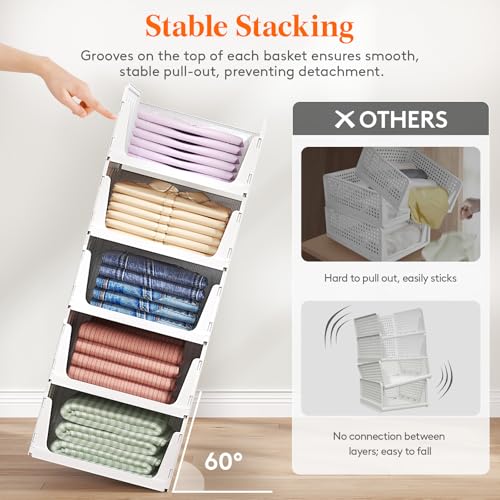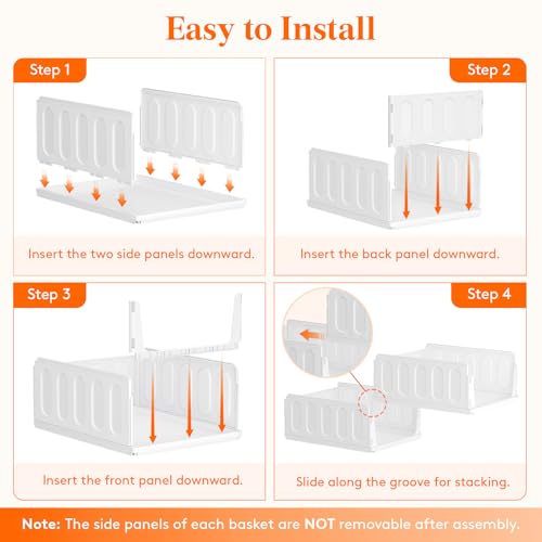 Easy Einbau and Customization: Follow the instructions for a simple and easy assembly process. You rund stack the plastic sweater storage for closet based on your preference and available space to maximize vertical storage. Please note that the side panels of each basket are non-removable after assembly
