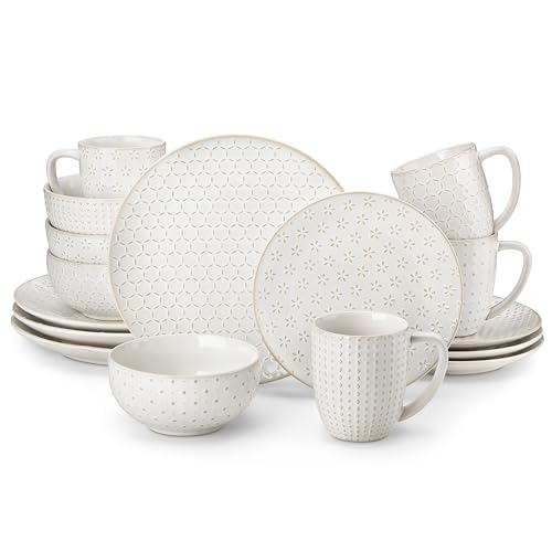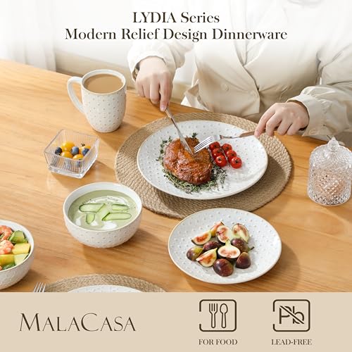 MALACASA 16 Pieces Dinnerware Sets, Modern Relief Design Plates and Bowls Sets, White Dish Set for 4, Kitchen Ceramic Dinner Plates Dishware Set, Microwave and Dishwasher Safe, Series LYDIA