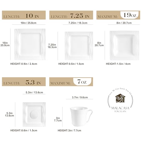 MALACASA 30 Pieces Dinnerware Sets, Modern Ivory White Plates and Bowls Sets for 6, Porcelain Dish Set with Dinner Plate, Dessert Plate, Soup Plate, Cup and Saucer, Square Dishware Set, Series Mario