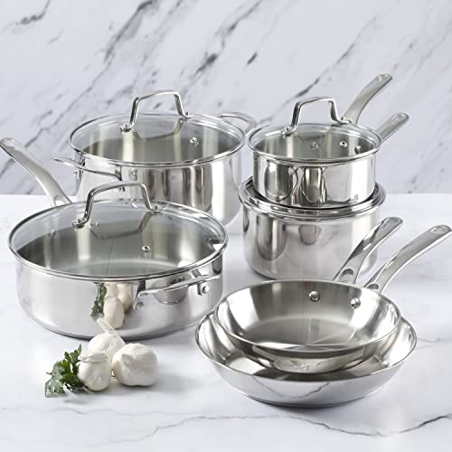 Martha Stewart Castelle 10 Piece 18/8 Durable Stainless Steel Induction Safe Non-Toxic Triply Bottom Kitchen Pots and Pans Cookware Set – Dishwasher Safe