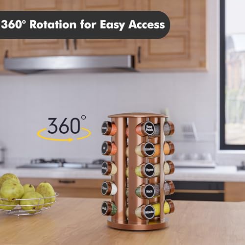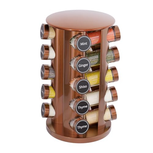 New England Stories Revolving Spice Rack Set with 20 Spice Jars, Kitchen Spice Tower Organizer for Countertop or Cabinet – Carousel Storage Includes 386 Spice Labels (Gold)